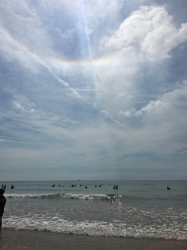 到青島,最不容錯過的就是陽光、沙灘、水中暢游啦!來到石老人海水浴場,放眼望去是蔚藍色的海洋,萬里的長空飄著潔白的云朵,遠處天空還出現(xiàn)了彩虹。