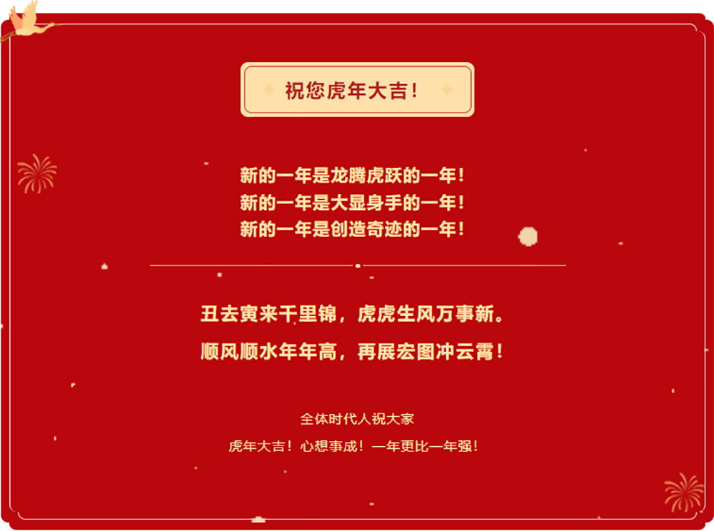 我們懷著熱切的渴望迎接虎虎生風的新的一年。新年的發(fā)展藍圖已經(jīng)鋪開,全體時代人將躍躍欲試奔赴新的征程!新的戰(zhàn)場!