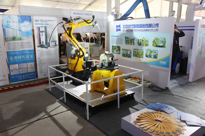 時代焊機作為職業教育領域的優秀焊接設備供應商應邀參加了本屆展會。展會的展位都設置在組委會搭建的臨時性展棚中,時代展臺的位置在C館的中央。展會中只有三家企業與焊接專業相關,時代是唯一一家專業焊接設備制造企業,其余兩家都是焊接模擬培訓儀的廠家。時代的展品以全新TD系列焊機集控系統、弧焊機器人設備為主。為了展示時代焊機的焊接教學系統解決方案,公司按真實尺寸1:1復制了焊接實操工位。工位里包括標準除塵系統、數字化焊接電源、焊機支撐架、多功能焊接操作架、監控探頭、氣瓶架及氣瓶、工具柜、槍掛鉤等,與真正的教學工位一模一樣。許多從事焊接教學工作的校長、老師對時代焊接實操工位很感興趣,大家仔細觀摩并詢問了不少細節問題。大家紛紛評價時代的工位實物展示全面細致,令人耳目一新。工位外四套時代焊機聯網組成的集控系統同樣吸引了大家的目光,老師們紛紛詢問該系統在實際教學和生產中的實際意義和用途,對時代新型焊機的外觀也大加贊賞。最吸引觀眾目光的還是時代弧焊機器人系統,本次展示包括機器人本體和小型變位機一套。機器人配合變位機焊接零件的過程,動作靈活準確。為了強化展出效果,展臺上布置了兩盞大功率的射燈將機器人照亮,耀眼的燈光將時代機器人高精度、高智能的風范勾畫得淋漓盡致。老師們對機器人的價格十分關心、同時還咨詢了不少教學系統編程問題。